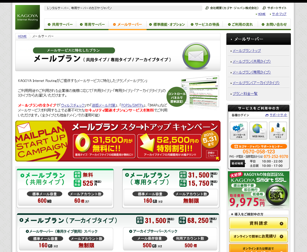 また、「メールプラン」提供開始を記念し、専用タイプとアーカイブタイプで初期費用が無料となるなど、2010年5月31日(月)まで「メールプラン スタートアップキャンペーン」を実施している。