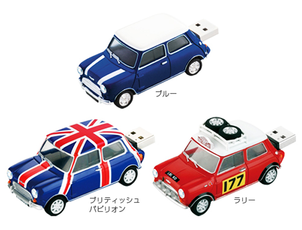 (株)グリーンハウスは、ミニクーパー型USBメモリ「ミニクーパーUSBフラッシュメモリ」シリーズに、ブルー、ブリティッシュパビリオン、ラリーの3モデルを追加。USB端子は車内に格納されており、シャシに付いたレバーをスライドすることでハッチから飛び出す仕様となっている。
