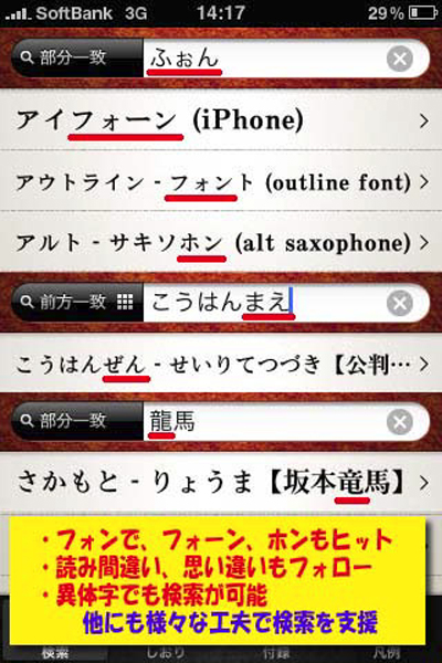 総項目数は約23万9000項目(漢字項目3557を含む)。また、手書き入力で漢字を検索でき、読めない漢字でも検索可能。さらに、検索方式には「前方一致あいまい検索」、「前方一致厳密検索」、「部分一致検索」の3種類を用意。この他、解説文中の文字列を検索することもできる。