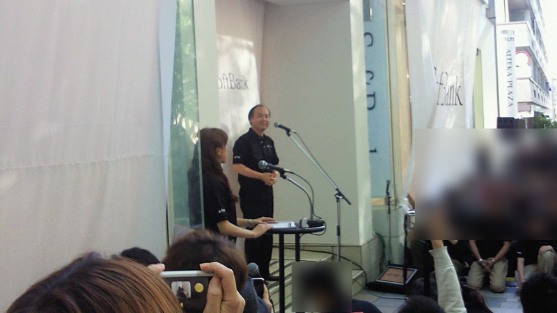 ![]() (8:00)少々時間を遡って、孫正義社長が登壇した場面をもう一枚。ものすごい笑顔です。 |