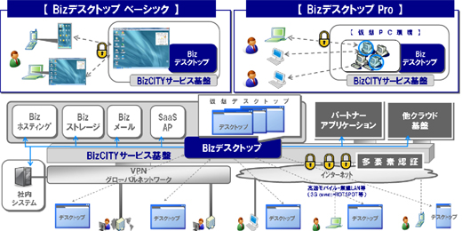 ラインアップは、Webブラウザを通じて仮想デスクトップおよび各種ビジネスアプリケーションが利用できる「Bizデスクトップ ベーシック」と、PCの一括管理やウィルス・セキュリティ対策、BCP対策などができる「Bizデスクトップ Pro」の2種類。金額はBizデスクトップ ベーシックが初期費用2万1000円(1契約ごと)、月額1260円(1IDごと)。Bizデスクトップ Proが初期費用2万1000円から、月額7万8750円から(30ID利用時の場合)となっている。