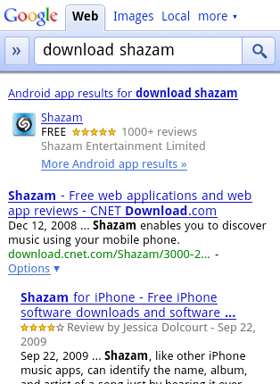 端末からGoogle.comにアクセスし、「download」「app」などの単語とアプリ名を組み合せて入力すると、検索結果のトップにアプリストアへのリンクが表示される。検索結果にはアプリケーションのアイコンや格付け、価格などが表示されるので、その場でアプリケーションの確認が可能となっている。