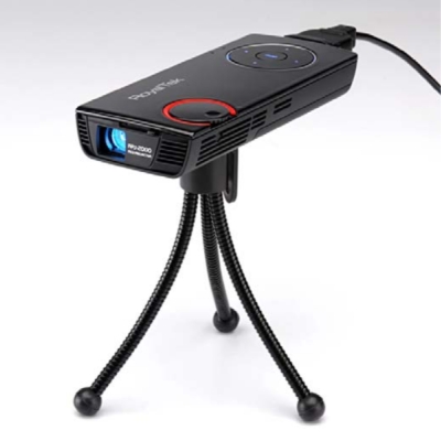 光源に3M社製RGB LEDを採用し、小型・軽量ながら明るい映像投影が可能。また、豊富なケーブル類を同梱し、iPhoneやPCのほか、ビデオカメラ/DVDプレーヤーなどさまざまな機器と接続できる。さらに、角度や高さの調整が可能な三脚を付属。