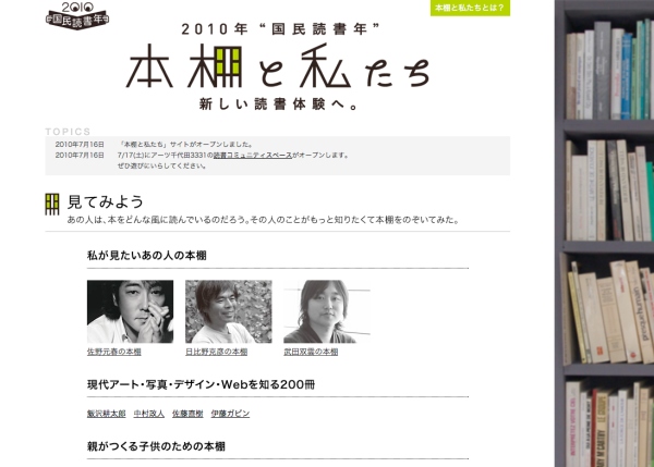 大日本印刷(株)は、2010年の国民読書年に向けた文化活動の一環として、本棚をテーマとした新しい読書体験を提供するためのプロジェクト「本棚と私たち」をスタートする。7月17日よりアートスペース3331 Arts Chiyoda内の「読書コミュニティスペース」と、Webサイト「本棚と私たち」を開設する。