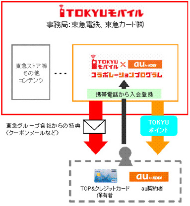 東京急行電鉄(株)とKDDI(株)と沖縄セルラー電話(株)は、東急カード(株)が発行するポイントカード「TOP&カード」とau携帯電話利用者向けに「TOKYUモバイル×au by KDDIコラボレーションプログラム」を開始すると発表した。