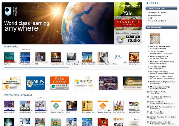 iTunes Uは、世界中の教育機関から提供されている35万以上のオーディオ・ビデオファイルにアクセスできるサービス。ハーバード大学、MIT(マサチューセッツ工科大学)、ケンブリッジ大学、オックスフォード大学、メルボルン大学、モントリオール大学といった、世界有数の教育機関がコンテンツを提供しており、誰でもアクセスすることが可能。また、コンテンツはすべて無料で利用することができる。