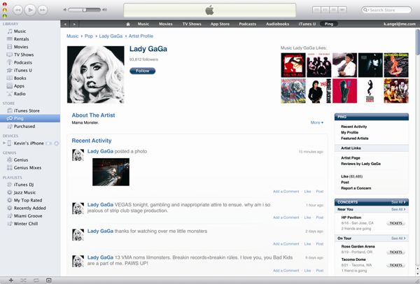 「iTunes 10」で新たに搭載された音楽ソーシャルネットワーク機能「Ping」は、好きなアーティストやユーザーをフォローしたり、フォローした人の動向をチェックしたり、好みの曲やどんな曲を聴いているのかなどをチェックすることができる。また彼らが勧める曲を試聴したり、気に入った曲を購入したりもできる。Facebookのアカウントと連携することもできる。「Ping」はiPhoneやiPod touchのiTunesアプリにも組み込まれているので、外出先からでもチェックすることができる。