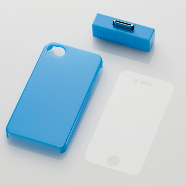 ポリカーボネート製のシェルカバーと液晶保護フィルムのほか、スピーカをセットにしたモデルだ。スピーカはシェルカバーと同色カラーを採用しており、Dockコネクタと接続するだけで使用できる。iPhone本体から電源の供給を受けるため、電池は不要。サイズは幅60mm×奥行15mm×高さ20mmで、前面にはボリュームボタンを装備している。カラーはブラック・ブルー・ピンク・ホワイトの4色で、価格は4200円。