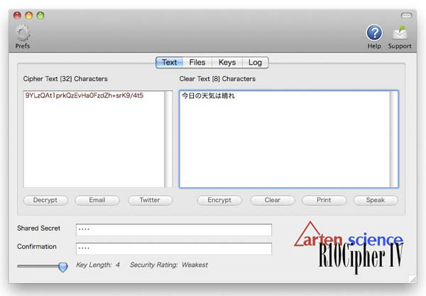Word、Excel、MP3などどんなファイル形式でも暗号化できる。セキュリティレベルはブローフィッシュブロック暗号を使って高くなっている。ファイルを暗号化するときはパスワードを設定する。暗号化されたファイルはR10CipherまたcuteCipherを使い、ダブルクリックとパスワードを入れて解凍する。ファイル解凍のみの使用は無料となっている。