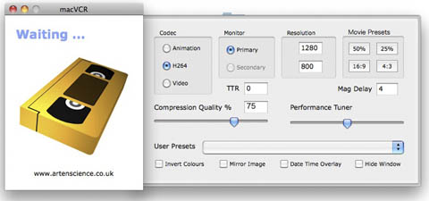 macVCRは、録画時間、解像度、圧縮率、コーデックなどの設定ができ、画面全体だけではなく、画面の一部の録画も可能になっている。録画したムービーはWindows、iPad、iPhoneなどで利用可能な形式にコンバートできる。プレゼンテーションやアプリ解説用のビデオ作成、ゲームとスクリーンセーバーの録画、インターネットで見るビデオやウェブカメラの録画などに活用できる。アプリは英語版であるため日本語の説明書がついている。