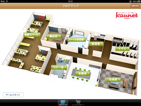 同アプリは、仮想オフィスを使ったオフィス用品の発注支援ツール。架空オフィスの中には会議室、ファイル保管庫、コピー室などの部屋があり、それぞれカウネットのおすすめ商品が掲載されているほか、ユーザが独自に選んだ商品を登録することもできる。