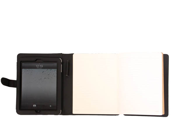 同製品は、シンプルな作りで、革のiPadケースにノートを収納するスペースが取り付けられたもの。シンプルながら、柔らかめの合皮仕上げでしっかりとしている。また、最大直径10mmのボールペンまで挿すことができるホルダーが付いているので、いざノートに何かを書こうとしたときペンを探すことがない。iPadのカバーをしたまま充電やボタン操作もできる。ノートは一般的なB5サイズ。無印良品の商品をベースにしたサンコーオリジナルのB5ノートが付属する。