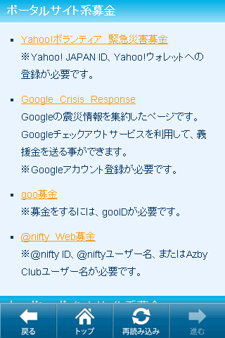 アプリの内容は、「災害時お役立ちアプリ」、「災害時お役立ちサイト」、「募金・義援金サイト」の3カテゴリーで構成され、各カテゴリーごとに、災害時に役立つと判断されたアプリまたはサイトを紹介している。例えば、最新情報、災害伝言版、消息確認、計画停電などの情報アプリや、怪我をした時や体調が悪くなった時に役立つアプリ、懐中電灯の代わりになるアプリ、各路線運行状況まとめサイト、ツィッターのオススメアカウント、各種義援金、募金サイト、著名人・有名人の義援金の呼びかけ、などといった情報が一つのアプリに集約されている。![]()