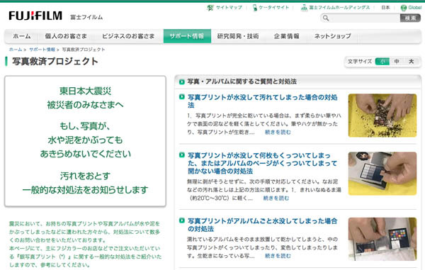 富士フイルム株式会社は、東日本大震災の被災地で、水や泥で汚れた写真プリントやアルバムを洗浄し救済する活動を支援する「写真救済プロジェクト」を開始した。電話またはインターネット経由で問い合わせを受け付け、個別相談に応じている。