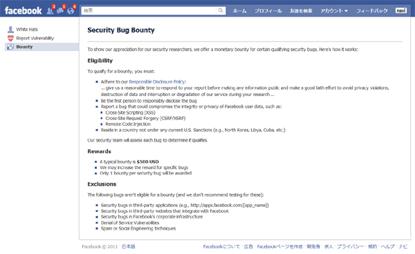 同社によると、報奨金の額は1つのセキュリティホールにつき500ドルが基本だが、内容によっては増額するとしている。 尚、キュリティホールを見つけた場合にはFacebook側の対応が完了するまで口外しない等のルールに従うことが条件となる。 また、Facebook上でサードパーティが提供しているプログラムについては対象外となる。