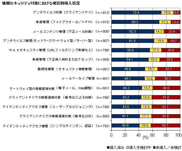 また、7割以上の企業がウイルスやスパイウエアなどのマルウエアを脅威と感じているものの、スマートフォンなどのモバイル機器やクラウドサービス利用で脅威を感じる企業は2~3割と低い結果となった。さらにウイルス対策は7割以上、ファイアウォール/VPNと不正メール対策、Webセキュリティ、IDS/IPSは5割以上、情報漏洩対策やアイデンティティアクセス管理といった内部統制対策は4割程度の導入率となっている。