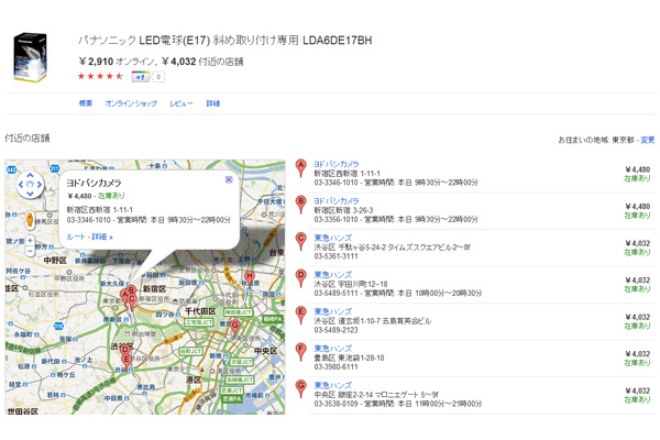 情報の閲覧は、商品を検索後に表示される「付近の店舗」をクリックして実行。ここでの「付近の店舗」とは、検索結果の上部にある「お住まいの地域」で設定した場所に基づく処理となる。この「ローカルショッピング」機能は、今後もパートナーを増やして、検索可能な実店舗を増加する予定。近々、ローソンの店舗なども検索可能となる。