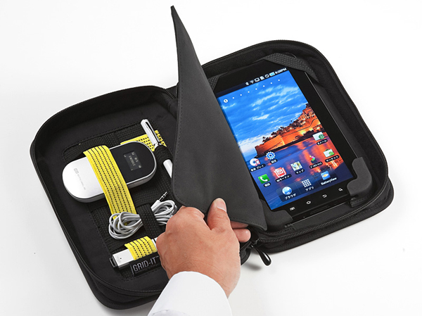 周辺機器は細い特殊なゴム糸で施されたGRIT-ITでしっかりと固定するため、どんな小物でも滑り落ちることがない。また、タブレット収納部の上面にもGRID-ITの特殊なゴムを装備しているので、しっかりとタブレットを固定することが可能だ。