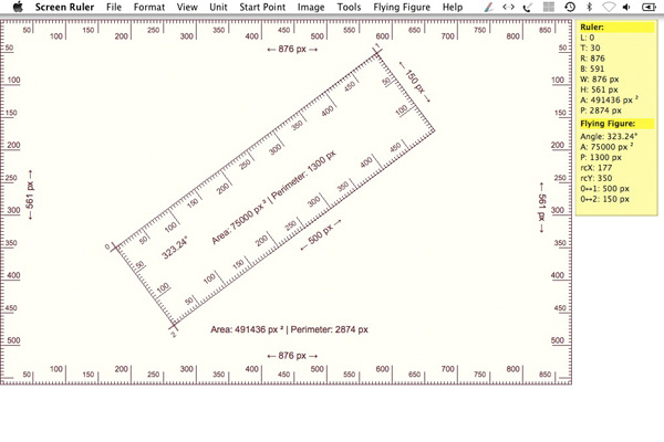 本製品は、角度やサイズ変更も含めたフレキシブルな移動が可能な半透明の定規を、画面上に表示できるソフトだ。起動中のソフトの最前面に表示させる設定も行え、定規の形はベーシックな長方形のほか、三角形/円形などにも変更できる。複数の定規の同時表示に対応し、背景色や不透明度の調整も可能。目盛りの単位はピクセル/インチ/センチ/ミリ/ポイントから選択でき、定規の変更に合わせた面積などの表示も行われる。