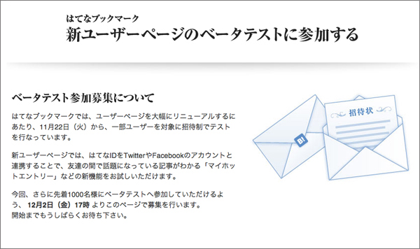 新ユーザーページは、11月22日から、3000人規模のクローズドベータテストを行っているが、今回、招待のないユーザーでも利用できるように12月2日(金)17時から、参加者を1000人追加で募集する。