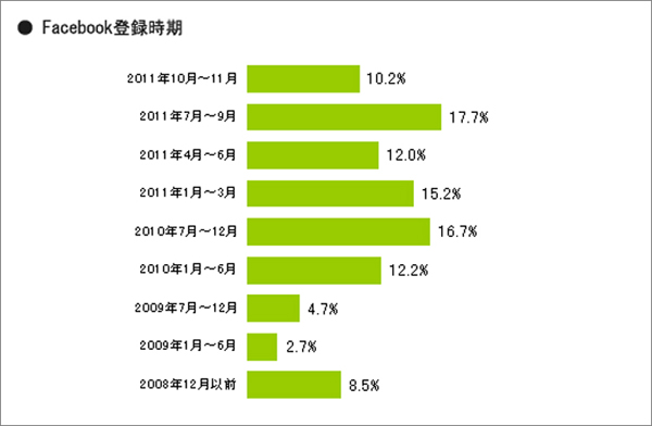 MMD研究所は、2011年11月11日~11月20日の10日間、モバイル・インターネットWEBによるオンライン調査にて「Facebookインサイト調査」を実施した。これによると「Facebookユーザーの半数が2011年になってから利用するようになった」と回答したことがわかった。