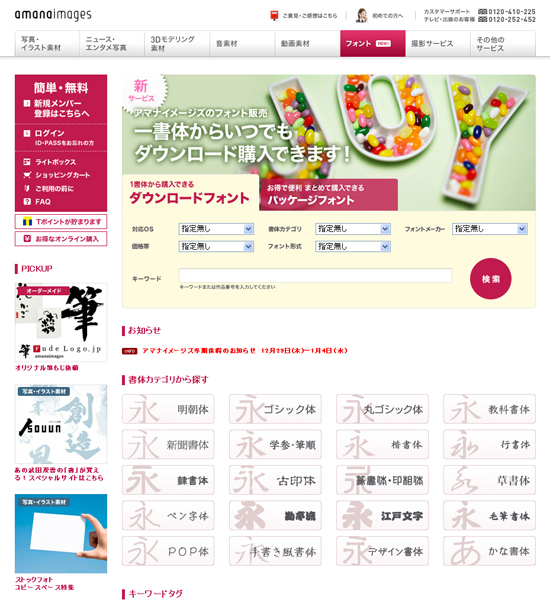「ダウンロードフォント」および「パッケージフォント」は、モリサワ、モトヤなどの代表的なフォントメーカー30社、合わせて2000書体以上を販売するフォントサービス。豊富なラインナップを揃え、“伝統的”“力強い”といったキーワードや明朝体、POP体などのカテゴリ、フォントメーカー名から使いたいフォントを検索できるほか、実際に使用するコピーや文章を入力し、文字色や背景色を選んでシミュレーションできる画期的な機能も搭載する。
