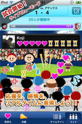 同アプリはスポーツ観戦をパブリックビューイングのように友人と共有できるアプリで、スタジアムのような一体感のあるコミュニケーションをリアルタイムに楽しめる。好きなチームのファンになることで試合の日時が通知される機能や、チームだけの日程情報をまとめて確認できる機能なども搭載する。