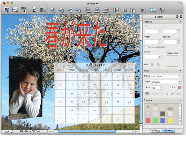 本ソフトには、100以上のテンプレートと1000以上のクリップアート集が用意されており、カレンダー/カード/ポスター/CDジャケット/PCの壁紙など、さまざまな制作物を手軽に作成することが可能だ。テキスト入力やオブジェクトの整列、重なり順の入れ替え、直感的なオブジェクト移動操作などの基本的なレイアウト機能を搭載し、ランダム配置などのユニークな機能も用意されている。配置した画像には不透明度/反射/影などの効果を加えられ、作成したデータは専用ファイルのほか、BMP/JPEG形式などの画像やテンプレートとしての保存が可能。最新バージョンでは、2012年カレンダーをはじめとする新テンプレートなどが追加されている。