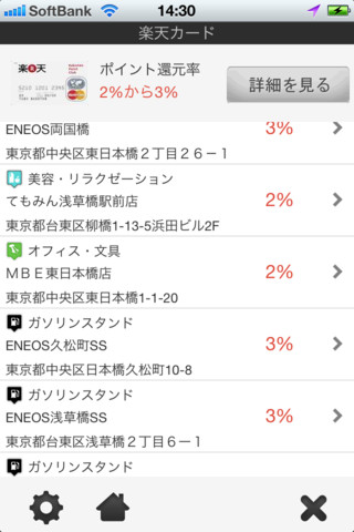 収録されている店は東京都内の約13000店で、主要なクレジットカード一覧から検索したいクレジットカードを選択すると、よりポイントが貯まりやすい店を現在地周辺から探せる。