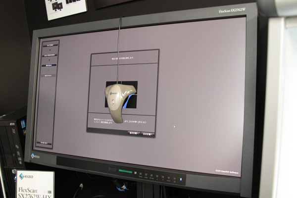 ブースに展示されていたFlexScanシリーズの「SX2462W-HX」には、カラーマッチングツール「EIZO EasyPIX」が用意されていた。キャリブレーションセンサーで画面中央を測光することにより、簡単にキャリブレーションが行える。また、クリエイターにとって重要な「個々の印刷物に合わせたディスプレイの色表現」という点に主眼を置いているため、実際の印刷用紙の白色とディスプレイの白色を合わせることも可能だ。使い方としては、印刷用紙をキャリブレーションセンサーで直接測定したのち、ディスプレイの色基準を印刷用紙に合わせて設定。これにより、印刷物とディスプレイで色環境の統一が実現する。