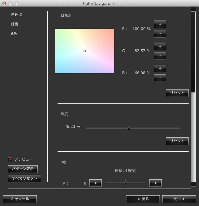ColorNavigator 6は、手動調整機能も搭載している。キャリブレーション後に微調整したい場合は、この画面で白色点・輝度・色合いなどを変更する