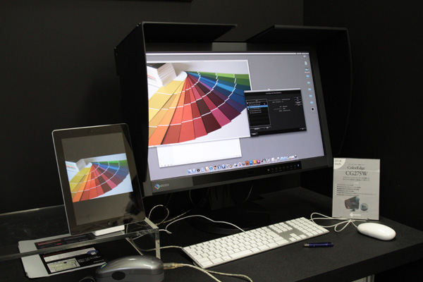 iPadのプロファイルを適用したディスプレイ。写真では環境光の反射により異なって見えるが、プロファイルが適用されたディスプレイの再現性は高い
