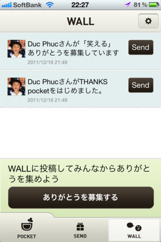 同アプリは、Facebookユーザー同士が「ありがとう」のメッセージを込めたカードを送受信し、「ありがとう」をコレクションことができるアプリ。Facebookの友だちの中から送りたい相手を選択し送信すると、送った「ありがとうカード」が自分のアプリの「pocket」に保存することが可能。コレクションした「ありがとうカード」は、アプリ内の「pocket」でいつでも見ることができる。
