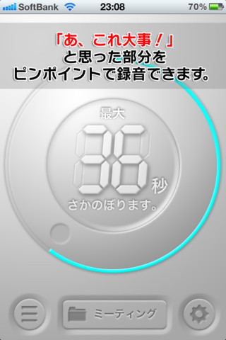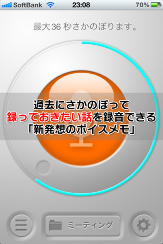 同アプリは最大60秒の時間をさかのぼって録音できるアプリ。話を聞いている途中に録音ボタンをタップすると設定した時間をさかのぼって録音を開始し、停止ボタンが押されるまで録音する。録音したボイスメモはフォルダごとに整理・管理することが可能で、フォルダ内のファイル名や日付でソートすることも可能。録音したボイスメモの中から必要な内容だけを選んでメールで送ることもできる。