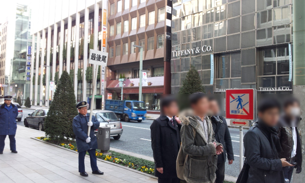 (07:10)アップルストア銀座前。すでにかなり並んでいます。行列はおよそ100mくらい