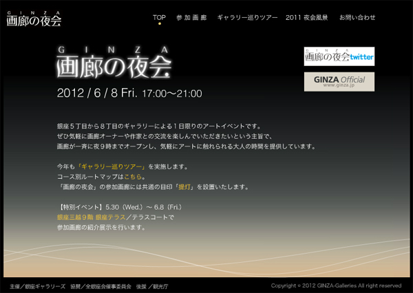 銀座ギャラリーズは、2012年6月8日に、銀座5丁目から8丁目の画廊にて「画廊の夜会2012」を開催すると発表した。