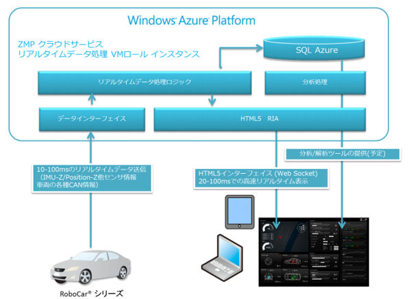ZMPは2009年から次世代自動車の開発環境としてRoboCarシリーズを販売しており、今回、トヨタ自動車株式会社のプリウスをベース車両とした「RoboCar HV」の発売に伴って、マイクロソフトのクラウドサービス「Windows Azure Platform」と連携させた開発環境を構築する。車載データ記録装置の機能をクラウドに移すことで、開発者は場所を選ばず遠隔での解析が可能となり、その結果を現場のスタッフに伝えたり、更新されたプログラムを実車に反映させたりできる。
