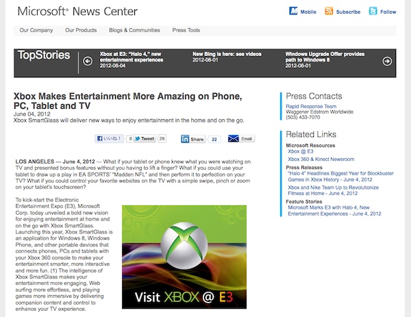 米Microsoftは、同社のビデオゲーム機「Xbox 360」とタブレット端末やスマートフォンを連携させることが可能なアプリケーション「Xbox SmartGlass」を発表した。