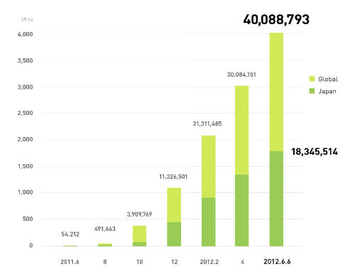 同アプリは2011年6月23日に公開されて以来、約10カ月後の2012年4月18日に登録ユーザー数が3000人を達成。1カ月に500万人以上のペースでユーザー数が増えており、5月12日には3500万人を突破。そして今回、6月6日に4000万人を突破した。現在、日本をはじめ世界230カ国以上で利用されているという。
