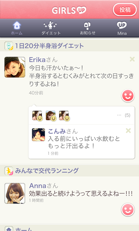 友達のダイエットの進捗状況が、フィードに表示されるので、お互いの状況を把握することで友人と一緒にダイエットを楽しく継続することができるのが特徴。また、ダイエットを達成すると、「GIRLS UP」オリジナルの可愛い画像がもらえるなど、ダイエットを楽しく続ける仕掛けが多数用意されている。