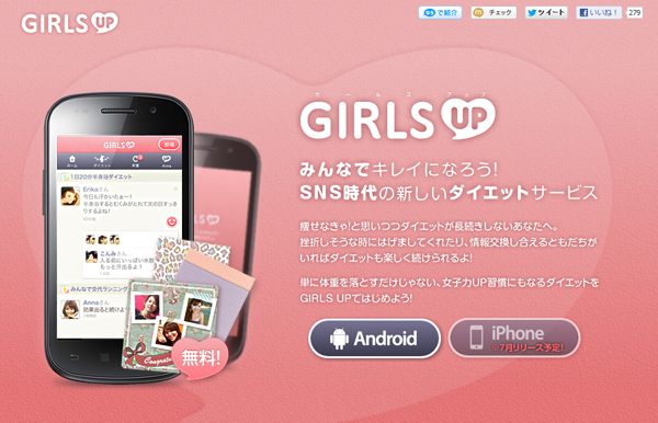 株式会社サイバーエージェントは、スマートフォン向けの女性限定ダイエットSNS「GIRLS UP」の提供を開始した。価格は無料で、「Google play」でダウンロードできる。またiPhone版は7月にリリースされる予定だ。