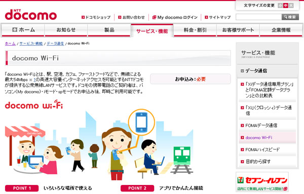 同サービスは最大54Mbpsでインターネット通信を可能にする公衆無線LANサービス。spモードやmopera Uなどのプロバイダオプションとして月額315円で利用できる。月額料金が2013年3月31日まで無料になるキャンペーンも実施。新規利用可能なエリアはWebサイトで確認できるほか、専用サイトから検索することも可能だ。