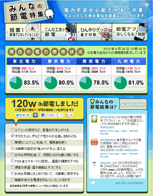 利用者同士のアイディアを共有することで、効率的な節電ができるよう支援。特集内で「節電で工夫していることは?」というアンケートを実施し、結果を公開するほか、Q&Aコミュニティサイト「BIGLOBEなんでも相談室」と連携し、“節電アイディア”、“暑さ対策”などに関するQ&Aを紹介。さらに、Twitterに投稿された節電に関するツイートもリアルタイムに掲載する。