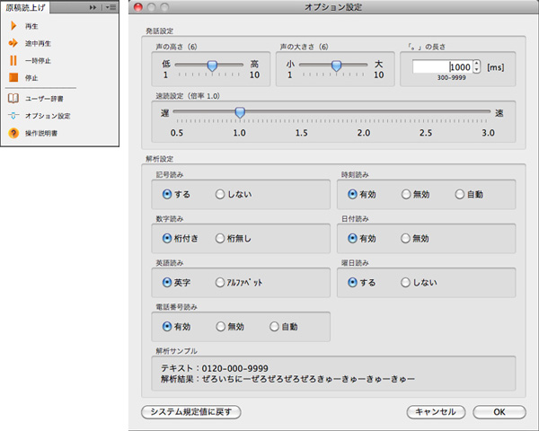 本プラグインに付属する音声データは落ち着いた女性の声で、滑らかな抑揚/リズムでの再生が実現されている。「行った」などの複数の読み方ができるテキストでも、前後の文脈から適切な読み方が決定され、単語間の関連性のデータベース化により誤読を低減。再生/途中再生/一時停止/停止などの制御は専用パネルで行うことができる。オプション設定により、声の高さ/大きさ/速さ/句点の長さをはじめとする多様な項目を設定することも可能。さらに、CSV読み込みにも対応して最大6万2000語まで登録可能な独自のユーザー辞書も搭載し、業界用語や専門用語などの未知語をサポートしている。対応OSはMac OS X v10.6および10.7。