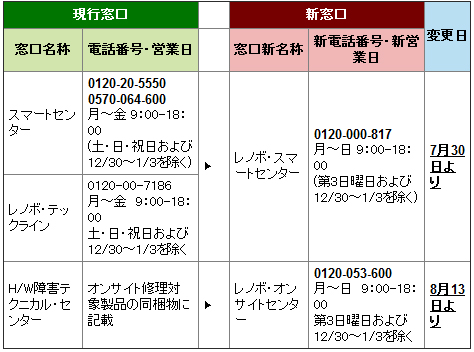 新窓口への変更日は、「レノボ・スマートセンター(旧『スマートセンター』および『レノボ・テックライン』)」が7月30日で、「レノボ・オンサイトセンター(旧『H/W障害テクニカル・センター』)が8月13日。