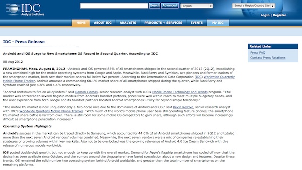 米IDCが2012年第2四半期(4~6月)における世界のスマートフォン市場調査を実施した。調査によると、Android端末の出荷台数は前年同期比106.5%増の1億480万台で、シェアは68.1%という結果になった。