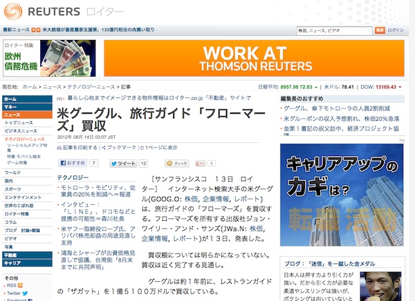 記事によると、広報関係者による情報では約1年前にグーグルが買収したレストランガイド「ザガット」とフローマーズのサービスを統合する予定だが、当面はフローマーズのブランドで観光情報などを提供するとしている。