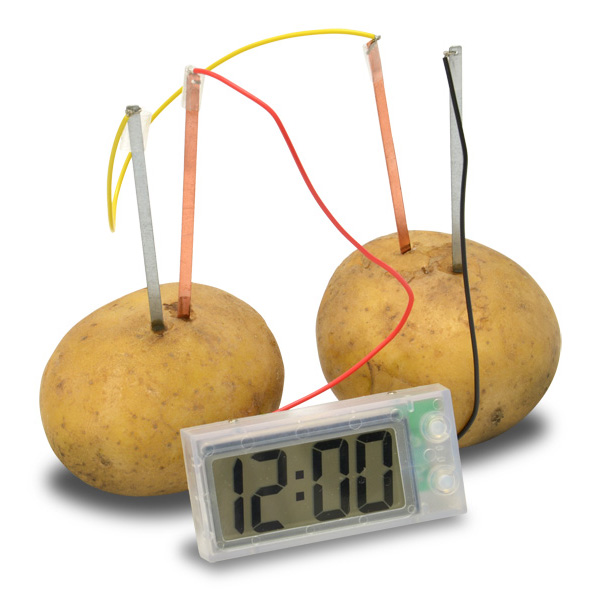 本製品で、“電池”代わりに使用できる野菜や果物は、じゃがいもや林檎、レモン、トマトなどの「リン酸」が含まれているもの。そのほか、炭酸飲料などを使用することもできる。それらに挿した亜鉛板が溶け出すことによって、電流を生む化学反応を起こす仕組み。キットには、デジタル時計のほか、亜鉛板×2/銅板×2/ケーブル×1/カップ×2/固定テープなどが含まれている。ケーブルを除く時計のサイズは65(幅)×31(高さ)×11(奥行)mmで、重量は約21g。