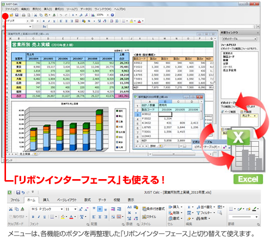 同ソフトは表計算ソフト「JUST Calc」やプレゼンテーションソフト「JUST Slide」、ワープロソフト「JUST Note」、日本語入力システム「ATOK Pro for Windows」などをセットしたオフィス互換ソフト。新版では「JUST Calc」と業務システムを連携できるAPIを提供するほか、Microsoft Office文書との互換性を高めて、ツールバーインターフェイスに加えてリボンインターフェイスも採用した。
