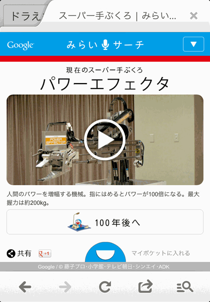 スマートフォンからGoogle音声検索を利用して「ドラえもーん」と検索すると、検索結果にひみつ道具が表示される。タップすると同サイトに移動し、現在のひみつ道具と100年後のひみつ道具が楽しめる仕掛けだ。ひみつ道具はマイポケットでコレクションすることが可能。10個集めると楽しいひみつ道具がもらえる。